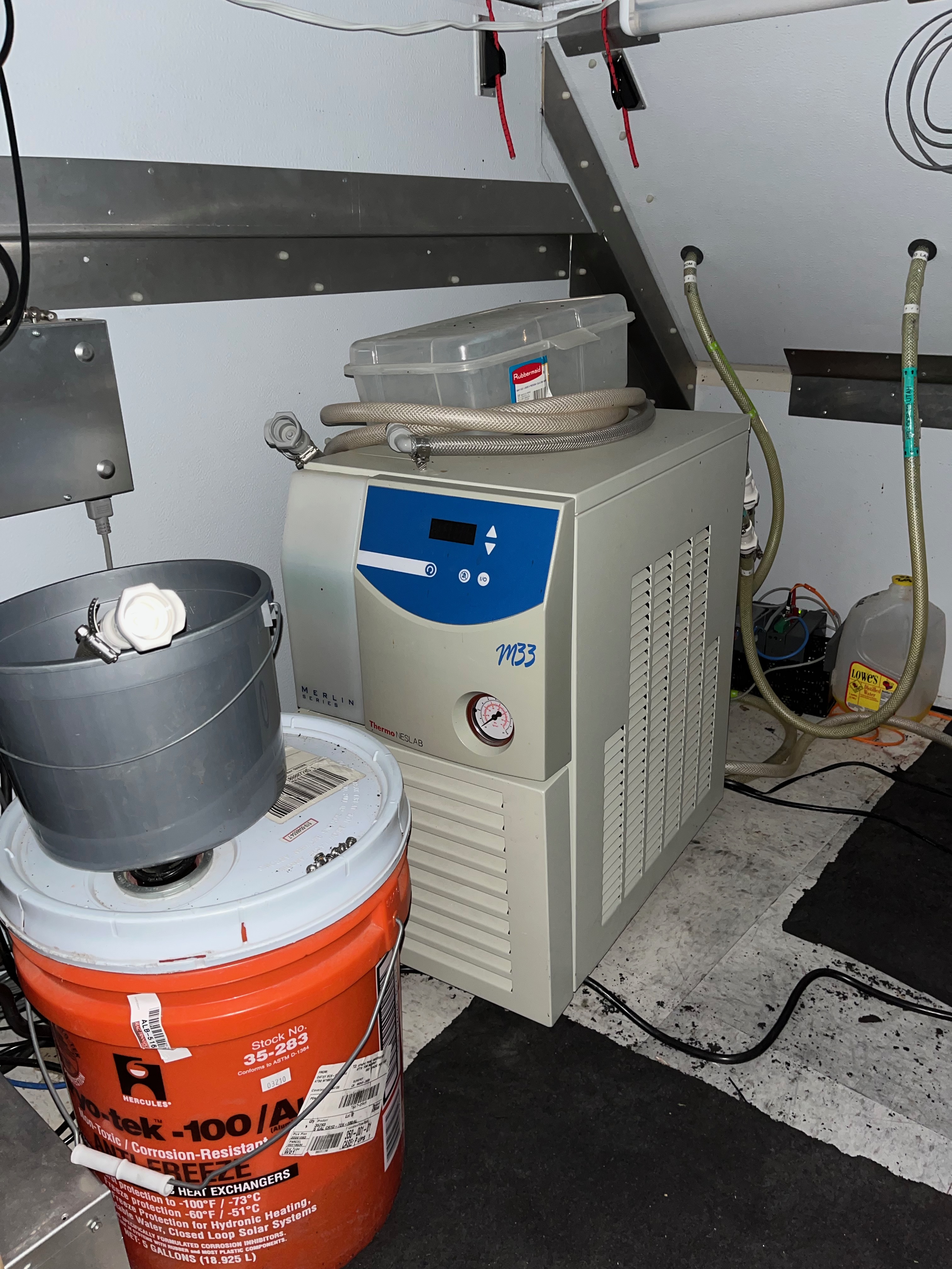The M33 chiller uses a mix of water and propylene glycol for active cooling of the Utah box. Normally the unit is left with power on all the time, with its behavior controlled by the housctl progam. It is normal for this unit to beep and complain about "LoFl" or low flow for part of the time while it is running. In case a human needs to intervene, here is the front side of the unit and the power switch on the back:
