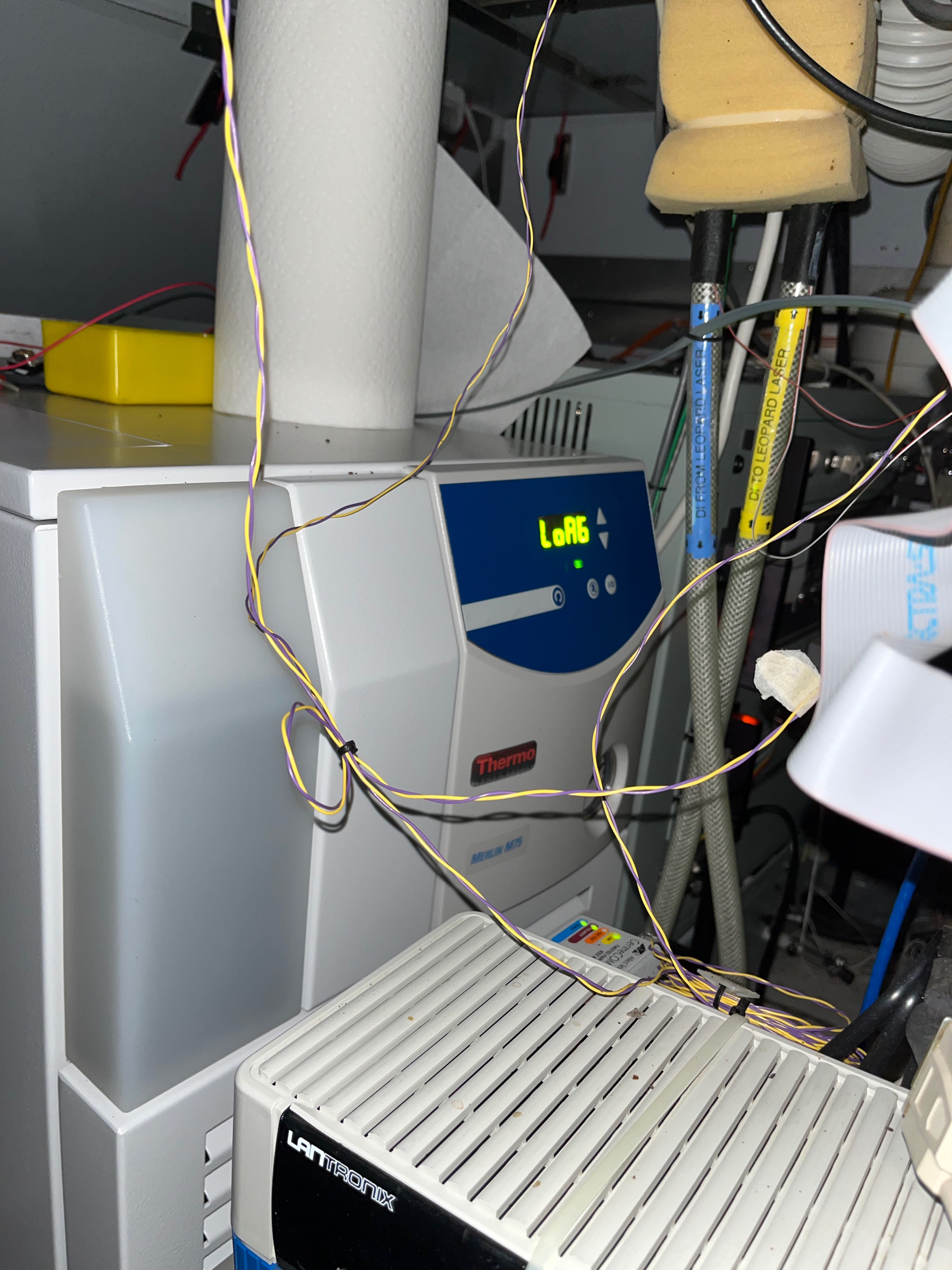 The M75 chiller uses distilled water only and runs it through the heat exchanger which is responsible for cooling a separate distilled water loop that runs up to the laser heads. Normally the unit is left with power on all the time, with its behavior controlled by the housctl progam. It is normal for this unit to beep and complain about "LoFl" or low flow for most of the time while it is running. In case a human needs to intervene, here is the front side of the unit and the power switch on the back: