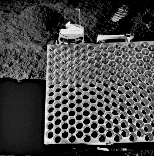 The Apollo 14 retroreflector array is very much like the Apollo 11 array in design: 100 3.8 cm reflectors in a 10×10 square pattern. Unlike the picture of the Aollo 11 array, this one has sunlight on its face, enabling a better view of the array of corner cubes. Is that a ziploc bag in the background?