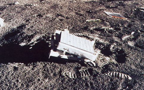 The Apollo 11 retroreflector array, consisting of 100 corner-cube prisms in a 10×10 array. Each corner cube is made of fused silica (quartz) and is 3.8 cm in diameter. The palette is 0.45 meters square, and carefully designed to minimize thermal gradients across the corner cubes as the array is slammed into and out of the sun's rays as the moon's phase changes. This prevents thermal distortions from seriously degrading the amount of light returned by the reflectors.