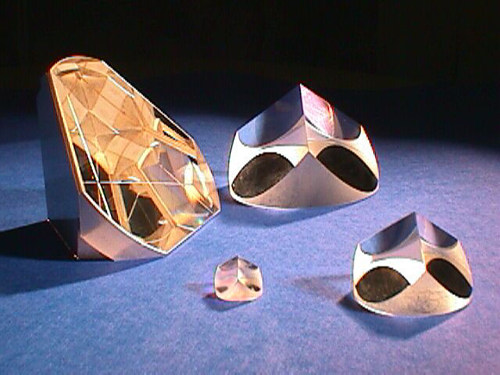 Retroreflectors, or corner-cube prisms, are optical devices that return any incident light back in exactly the direction from which it came. The central design concept is a trio of mutually perpendicular surfaces such as is found at the corner of a cube (look up into the corner of the room where the ceiling hits the walls). If these three surfaces are reflective, a light ray will bounce off each in turn, with the net result being a precise 180° turn. (Ever hit a racquetball right into the corner and had it come right back at you?). Retroreflectors are in tail-light covers (feel the sharp bumps on the inside of one), bike reflectors, and in paints for road signs (very tiny crystals).