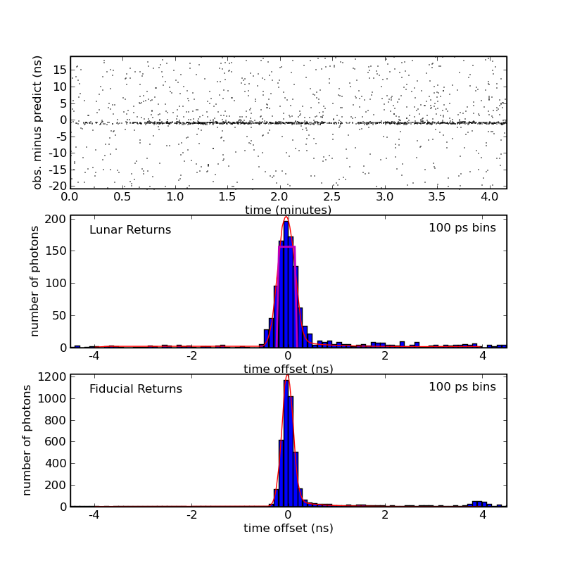 In each plot, the top panel shows a 40 nanosecond window of observed round trip time minus the predicted range. Background noise and detector dark current appear as scattered dots, while the lunar return is obvious in the middle. The middle panel shows a histogram of the linar returns, while the bottom panel shows the local "fiducial" corner cube return. The latter characterizes the APOLLO system response (laser pulse width, detector spread, timing electronics jitter). The Lunar return is additionally spread by the tilted reflector arraymodeled by the superimposed magenta trapezoidal shape. A functional fit to the fiducial return is convolved with the trapezoid to yield an expected shape of the lunar return, producing an approximately adequate result (fits are red curves). The asymmetric tail on both returns is due to diffusion of photo-electrons from deeply-penetrating photons in the APD detector.